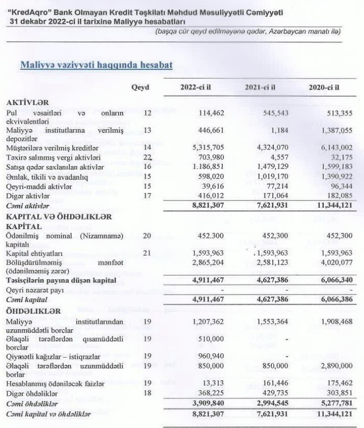 Marja.az təşkilatın maliyyə hesabatına istinadən xəbər verir ki, 2021-ci ildə 1 milyon 185 min manat olmuş faiz gəlirləri, 2022-ci ildə 1 milyon 109 min manata düşüb. Ötən il "KredAqro" 135 min manat haqq və komissiya gəlirləri də əldə edib (2021-ci ildə 74 min manat zərər).