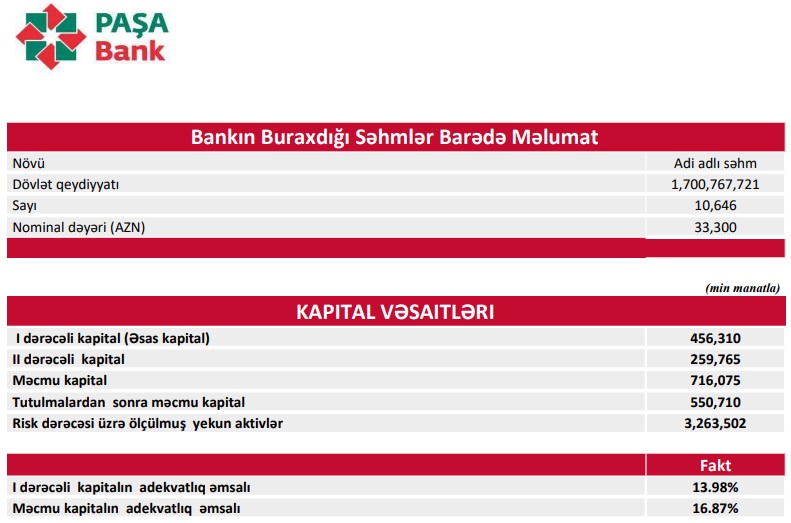 31 mart 2023-cü il tarixində "PAŞA Bank" 550 milyon 710 min manat məcmu kapitala malik olub.