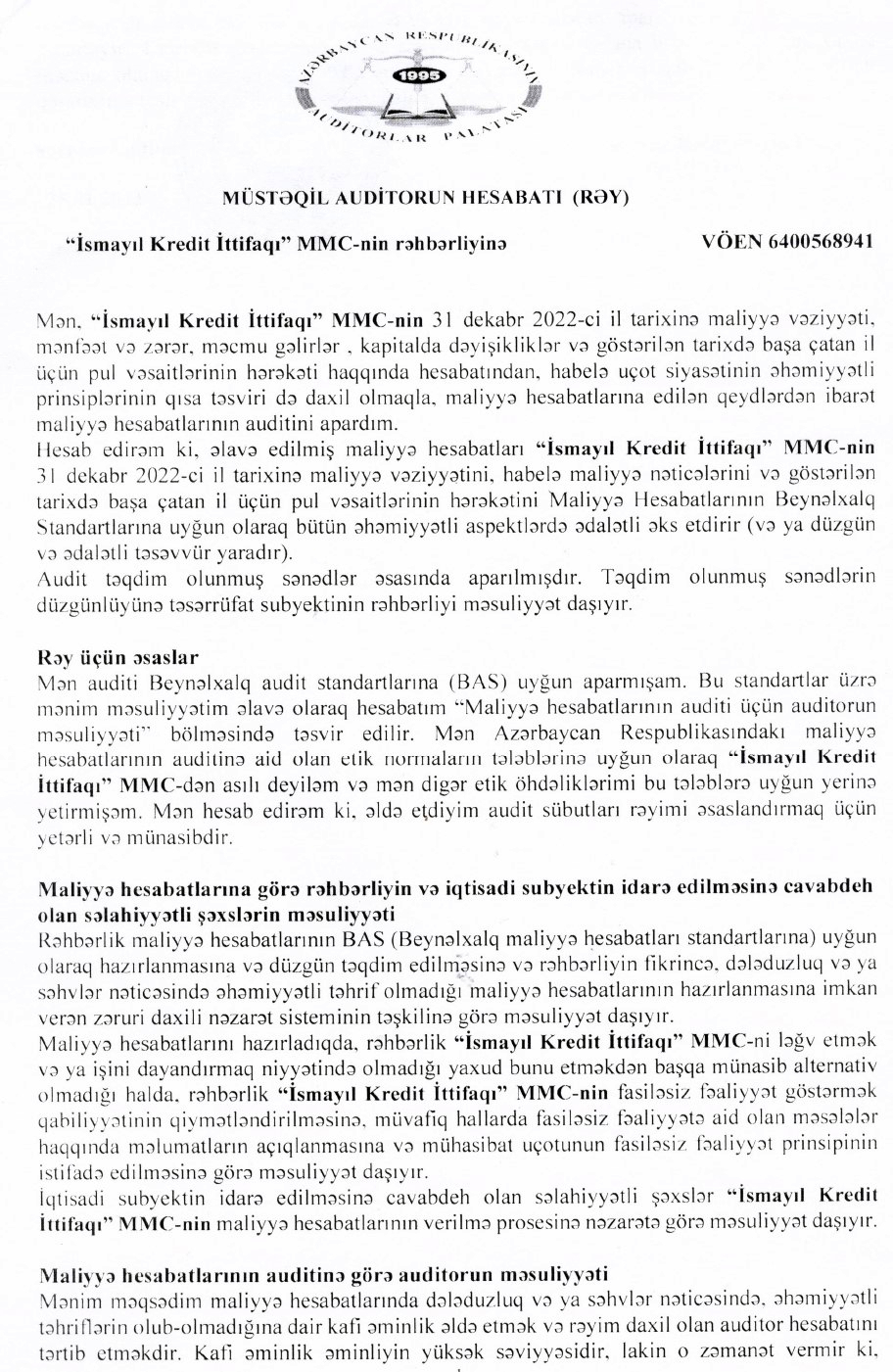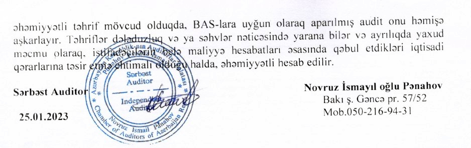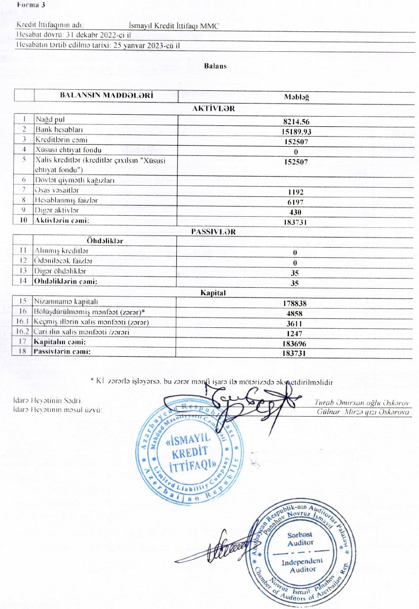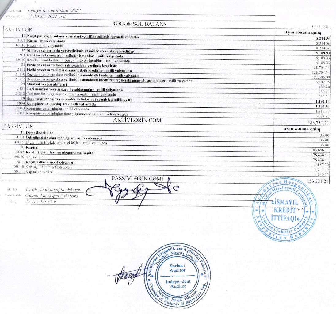 "İsmayıl Kredit İttifaqı" MMC-nin 31 dekabr 2022-c il tarixində bitən il üzrə maliyyə hesabatları.