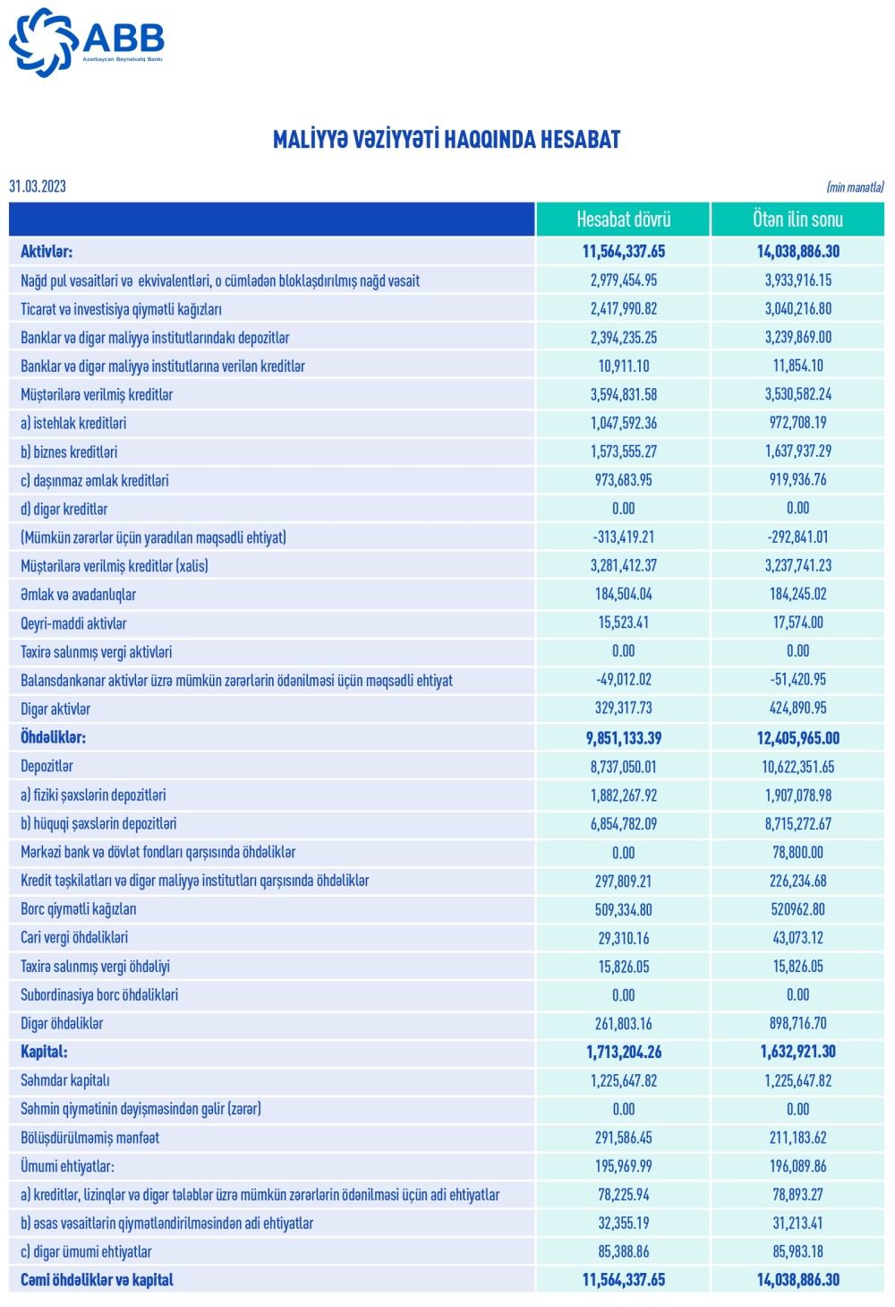 31 Mart 2023-cü il tarixində ABB-nin cəmi aktivləri 11,6 milyard manat, öhdəlikləri isə 9,9 milyard manat təşkil edib.