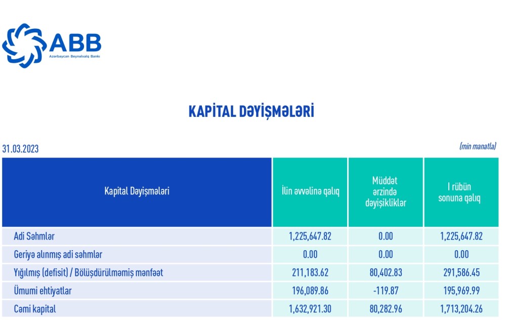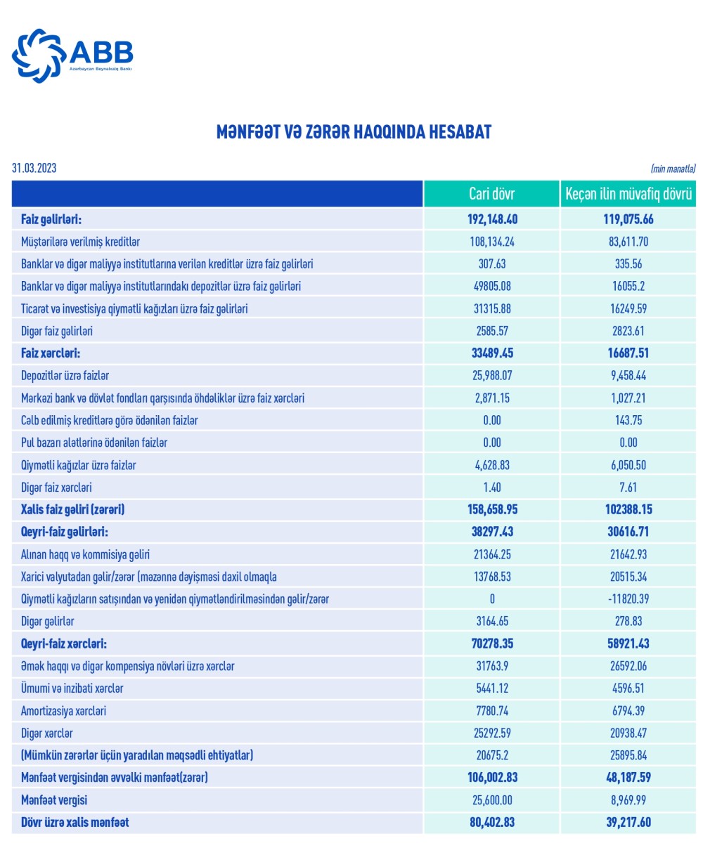 ABB ASC (Azərbaycan Beynəlxalq Bankı) 2023-cü ilin 1-ci rübü (yanvar-mart) üzrə maliyyə göstəricilərini açıqlayıb.