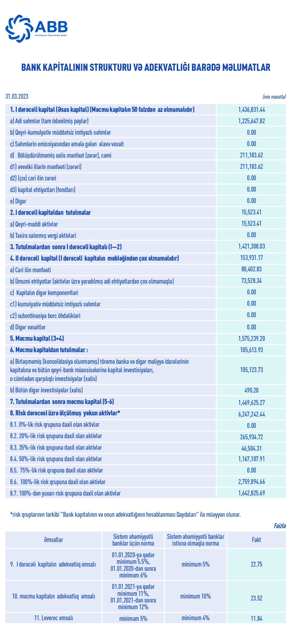 ABB 1,5 milyard manat məcmu kapitala malikdir. İlk rüb ərzində ABB-nin I dərəcəli kapitalının adekvatlıq əmsalı 22.75%, məcmu kapitalının adekvatlıq əmsalı isə 23.52% təşkil edib. Qeyd etmək lazımdır ki, bu göstəricilər tənzimləyici orqanın müəyyən etdiyi normalardan (müvafiq olaraq sistem əhəmiyyətli banklar üçün minimum 6% və 12%) əhəmiyyətli şəkildə yüksəkdir. Bank 31 dekabr 2022-ci il tarixində 1,4 milyard manat məcmu kapitala malik idi.