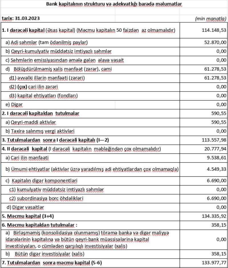 31 Mart 2023-cü il tarixində "Bank of Baku" 133 milyon 978 min manat məcmu kapitala malik olub. Bank 2022-ci ilin sonunda 127 milyon 606 min manat məcmu kapitala malik idi.