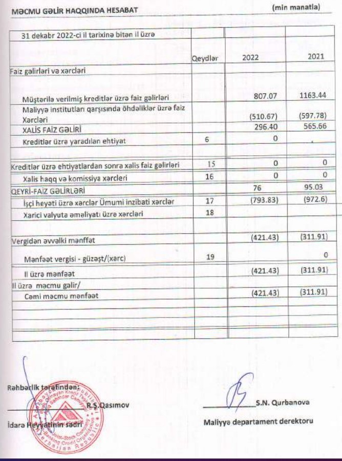 “Finex Kredit” BOKT ASC 2022-ci ili 421 min manat xalis zərər ilə başa vurub. Təşkilat 2021-ci ili 312 min manat xalis zərər ilə başa vurmuşdu. Xalis zərərin artması gəlirlərin azalmasından qaynaqlanır.