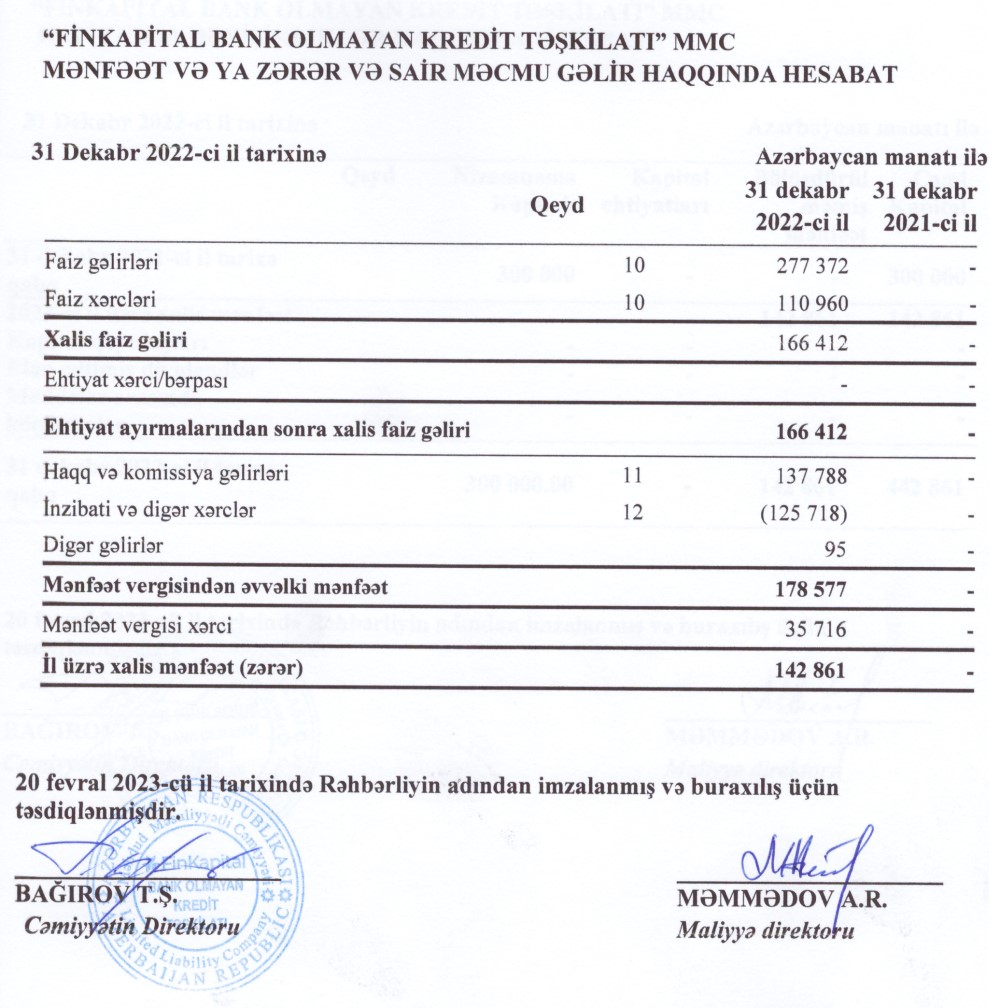 2022-ci ilin yanvar ayında faktiki fəaliyyətə başlamış "FinKapital Bank Olmayan Kredit Təşkilatı" ilk ilini 142 min 861 manat xalis mənfəət ilə başa vurub.