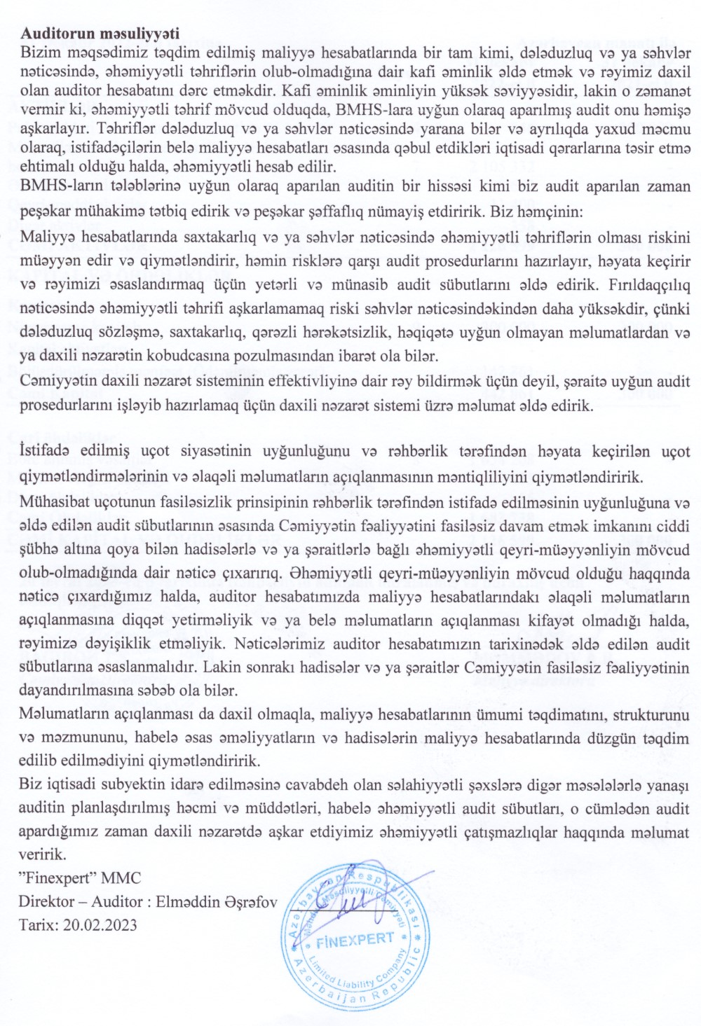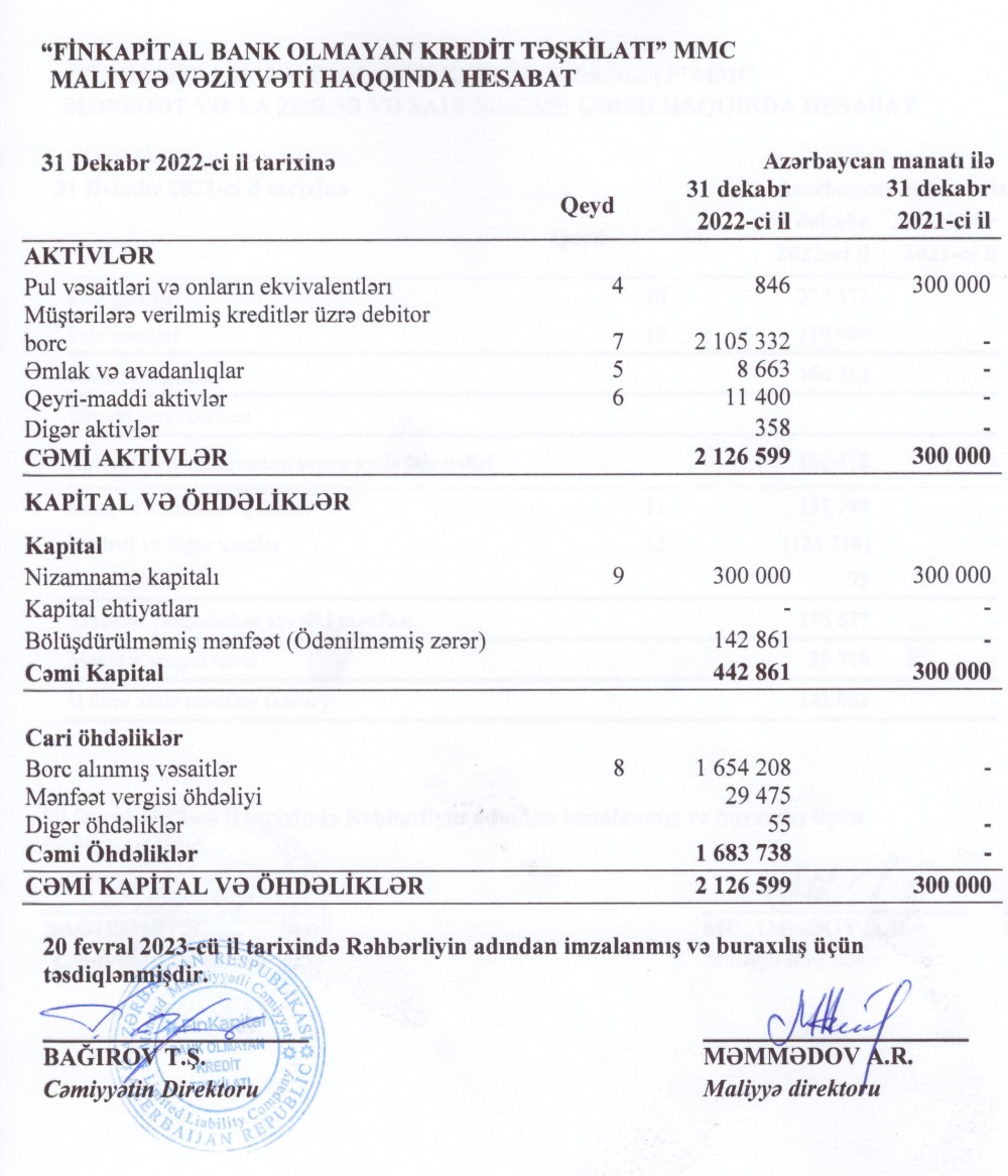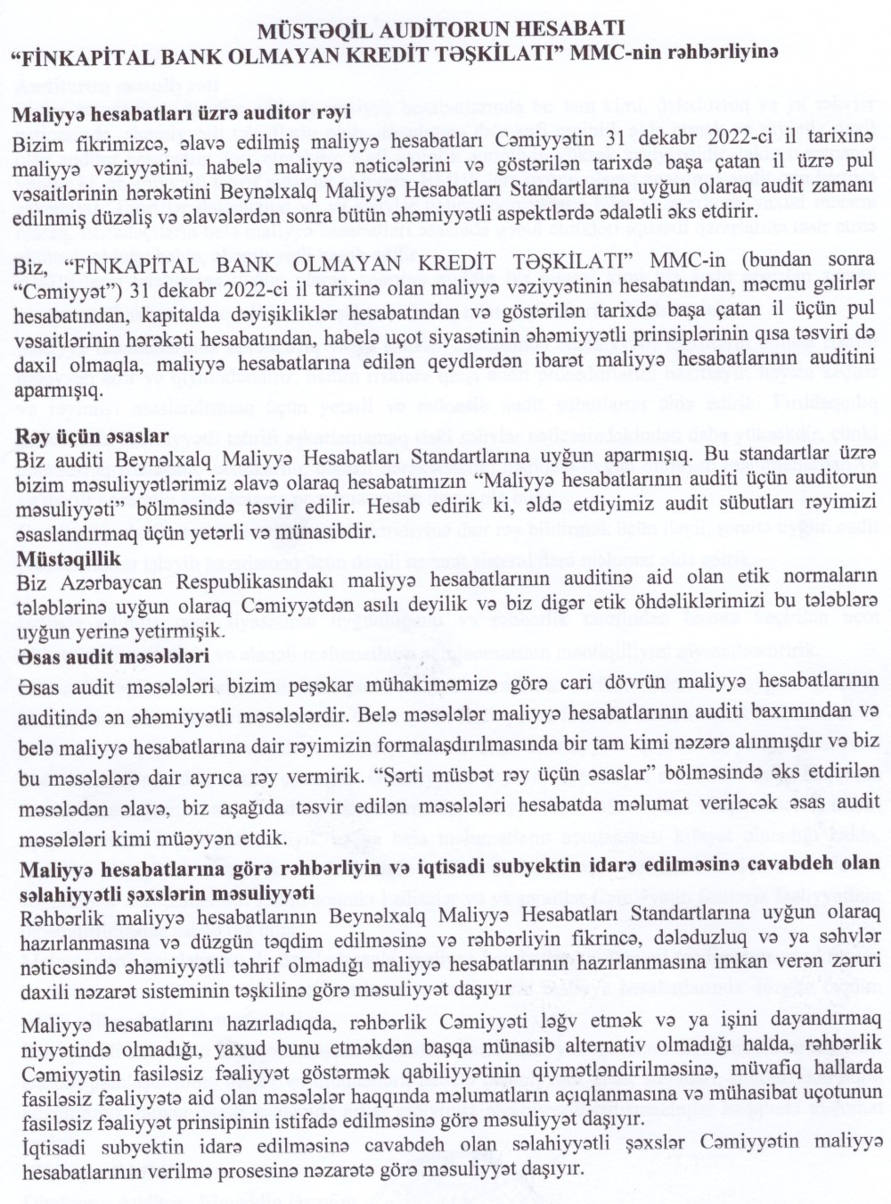 "FinKapital Bank Olmayan Kredit Təşkilatı" MMC-nin 31 dekabr 2022-ci il tarixində bitən il üzrə maliyyə hesabatları.