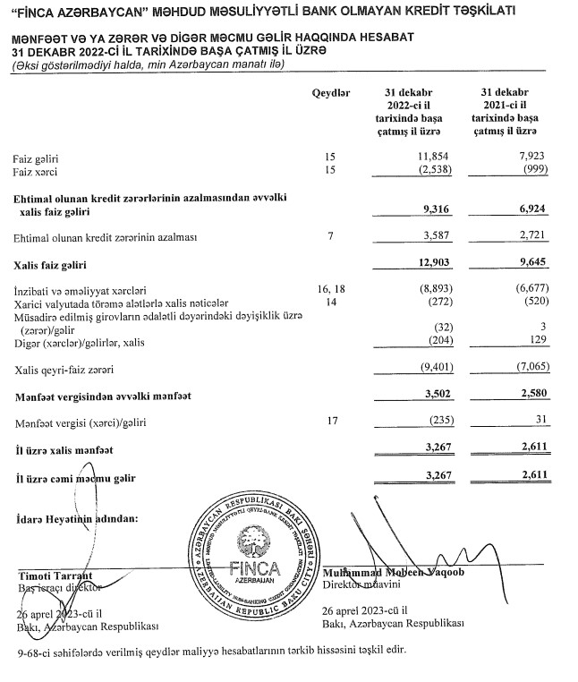 Marja xəbər verir ki, “FINCA Azerbaijan”nın faiz gəlirləri 2021-ci ildə 7 milyon 923 min manat ikən, 2022-ci ildə 11 milyon 854 min manata yüksəlib (3 milyon 931 min manat və ya 49,6% artıb).
