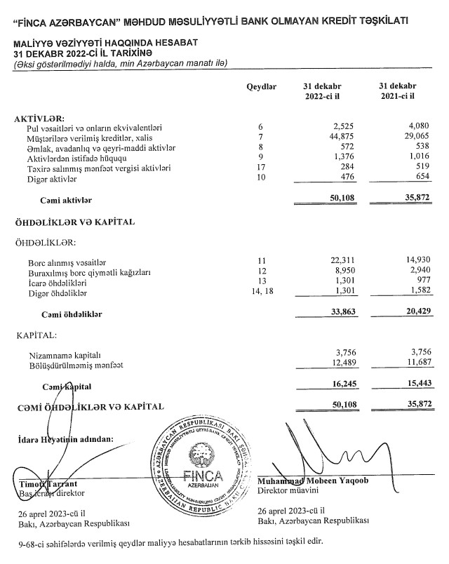 "Aztəminatlı insanlara və icmalara öz gələcəklərinə sərmayə qoymağa kömək etmək üçün dürüst və səmərəli maliyyə xidmətləri təklif edən qlobal şəbəkənin bir üzvü kimi “FINCA Azerbaijan” təşkilatı hesabat dövrü ərzində artan bazar ehtiyaclarını qarşılamaq üçün öz kredit təkliflərinin müxtəlifliyini saxlayıb",- təşkilatdan bildirilib.