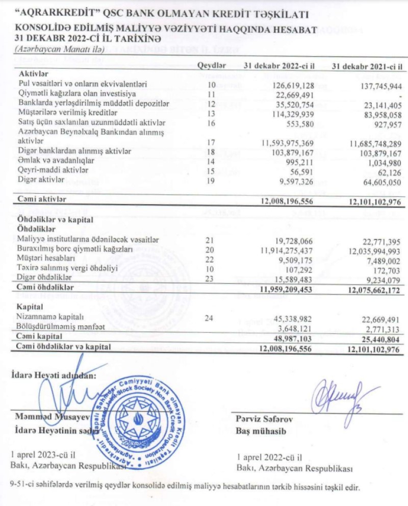Ötən il "Aqrarkredit"in kredit portfeli (müştərilərə verilmiş kreditlər) 30 milyon 371 min manat və ya 36,2% artaraq 114 milyon 330 min manata çatıb.