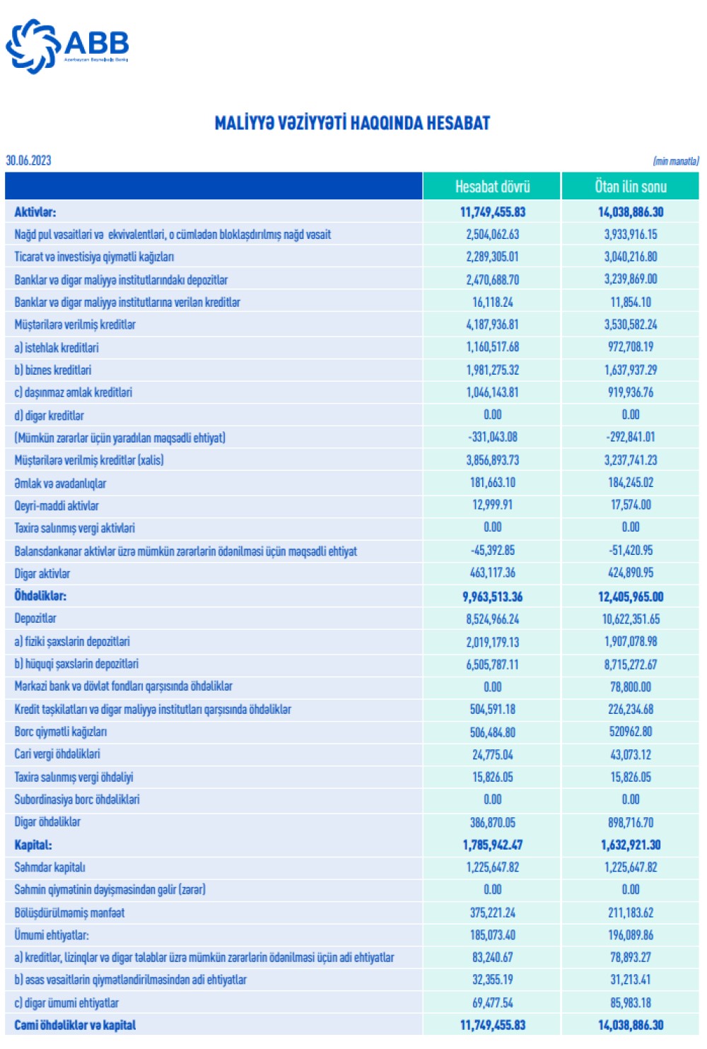 30 iyun 2023-cü il tarixində ABB 11 milyard 749 milyon 456 min manat cəmi aktivlərə malik olub.