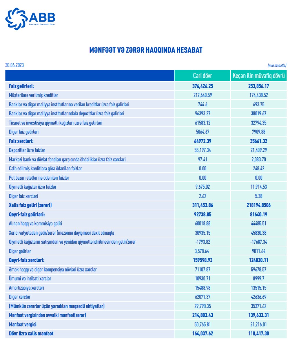 2023-cü ilin birinci yarısında ABB-nin faiz gəlirləri 122 milyon 570 min manat artaraq 376 milyon 426 min manat, qeyri-faiz gəlirləri isə 11 milyon 98 min manat artaraq 92 milyon 738 min manata yüksəlib.