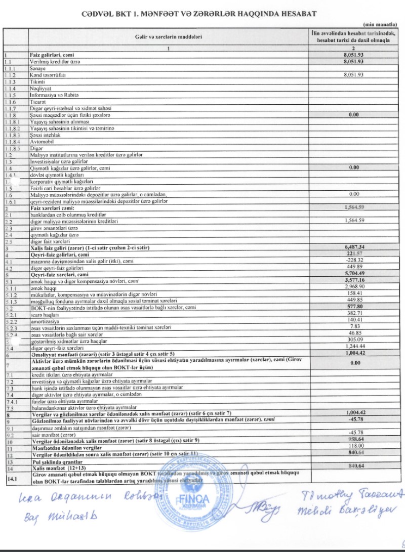 "Finca Azerbaijan" Qeyri-Bank Kredit Təşkilatı 2023-cü ilin birinci yarısını (yanvar-iyun) 840 min manat xalis mənfəət ilə başa vurub. Xatırladaq ki, Təşkilat 2022-ci ili 3 milyon 267 min manat, 2021-ci ili isə 2 milyon 611 min manat xalis mənfəət ilə bağlamışdı.