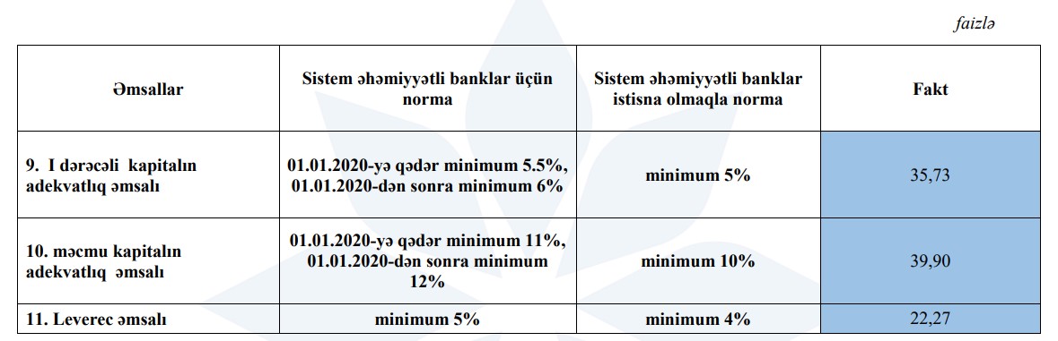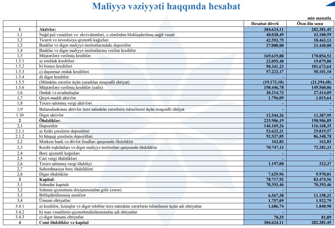 Ötən ilin 9 ayında Bankın cəmi əməliyyat gəlirləri 21 milyon 17 min manat, cəmi əməliyyat xərcləri 13 milyon 452 min manat, əməliyyat mənfəəti 7 milyon 565 min manat, mümkün zərərlər üçün yaradılan məqsədli ehtiyatlardan azad olmuş məbləğ 3 milyon 887 min manat təşkil etmişdi.