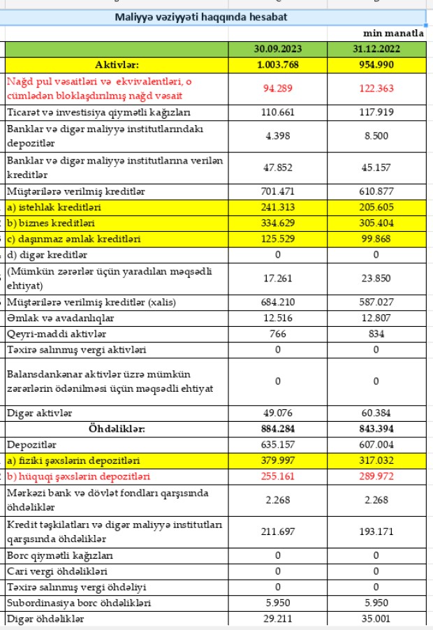 Ötən ilin müvafiq dövrü ilə müqayisədə bankın aktivləri 48.8 milyon və ya 5% artaraq 1 milyard 3 milyon manat təşkil edib.