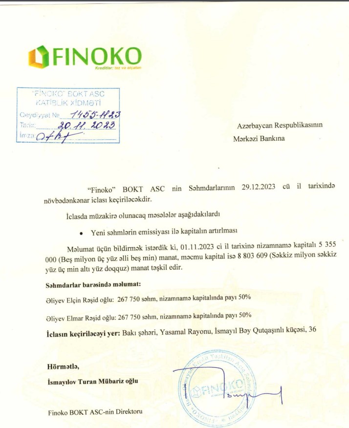 29 dekabr 2023-cü il tarixində "Finoko BOKT" ASC səhmdarlarının növbədənkənar yığıncağı keçiriləcək.
