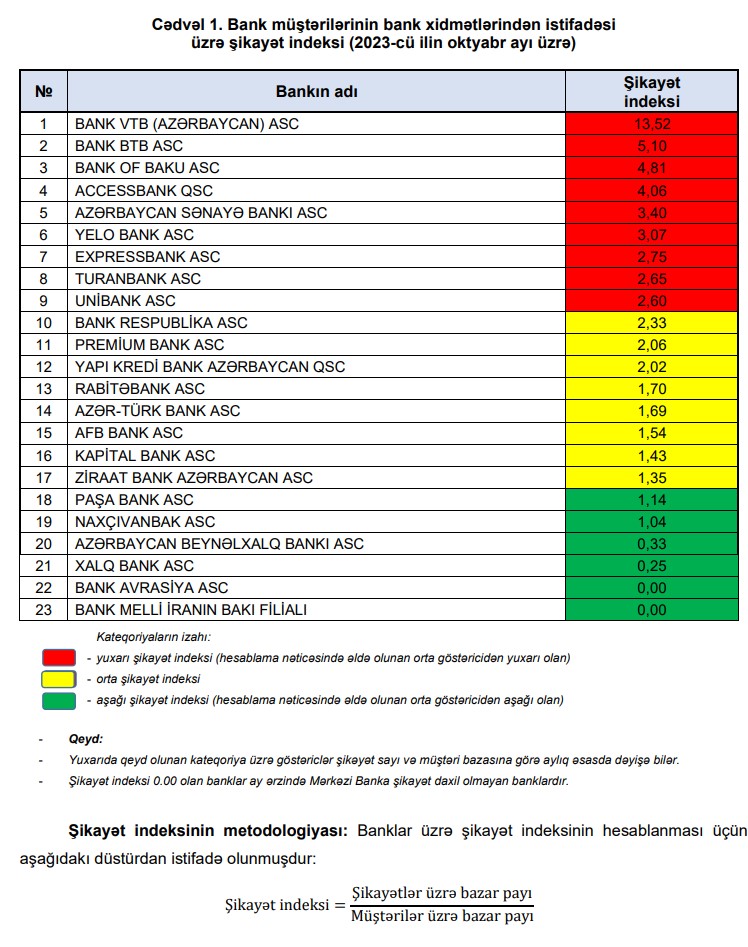 İndeksə görə – Bank VTB Azərbaycan, Bank BTB, Bank of Baku, AccessBank, Azərbaycan Sənaye Bankı, Yelo Bank, Expressbank, Turanbank və Unibank şikayət sayının yuxarı olduğu banklardır.