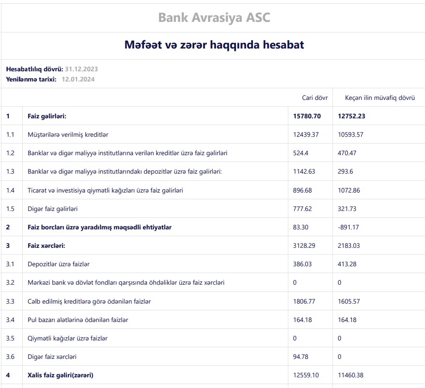"Bank Avrasiya" ASC 2023-cü ili 6 milyon 622 min manat xalis mənfəət ilə başa vurub. Bank 2022-ci ili 1 milyon 815 min manat xalis mənfəətlə bağlamışdı. Beləliklə, "Bank Avrasiya"nın xalis mənfəəti 2023-cü ildə 2022-ci illə müqayisədə 4 milyon 807 min manat və ya 3,6 dəfə artıb. Xalis mənfəətin artması həm gəlirlərin artmasından, həm də mümkün zərərlər üçün yaradılan məqsədli ehtiyatlardan qayıdan vəsaitdən qaynaqlanır.