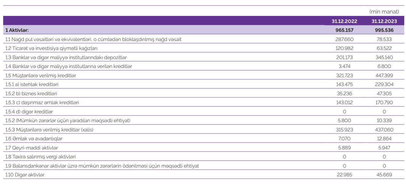 2023-cü il ərzində "Azər-Türk Bank"ın cəmi aktivləri 3,1% artaraq 31 dekabr 2023-cü il tarixində 995 milyon 536 min manata çatıb.