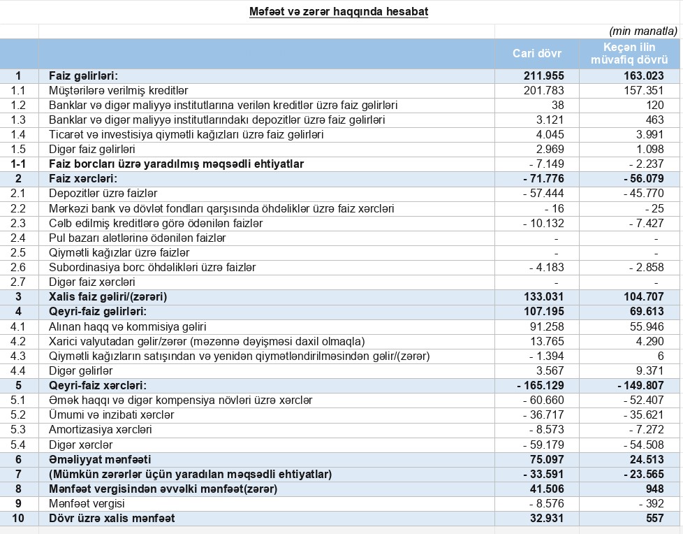 Eyni zamanda 2023-ci ildə qazanılmış faiz gəlirləri 212 milyon manata çatıb, qeyri-faiz gəlirləri isə 107 milyon manatı ötüb. Bununla da Bankın qeyri-faiz gəlirləri əvvəlki illə müqayisədə 54 %, faiz gəlirləri isə 37 % artıb.
