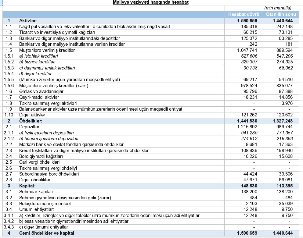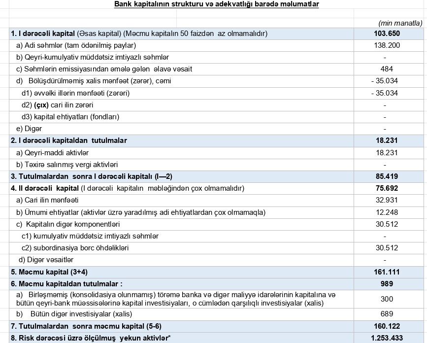 Bankın davamlı inkişaf strategiyasına uyğun olaraq, dövr ərzində Bankın kapital mövqeyi xeyli güclənib. İlin sonuna Bankın məcmu kapitalı əvvəlki ilin eyni dövrü ilə müqayisədə 25 % artaraq, 160 milyon manat olub. 2023-cü il ərzində Bank kapital adekvatlığını xeyli yüksəldib. Belə ki, ötən ilin sonunda bankın kapital adekvatlıq əmsalı artaraq, 12.8 % təşkil edib.