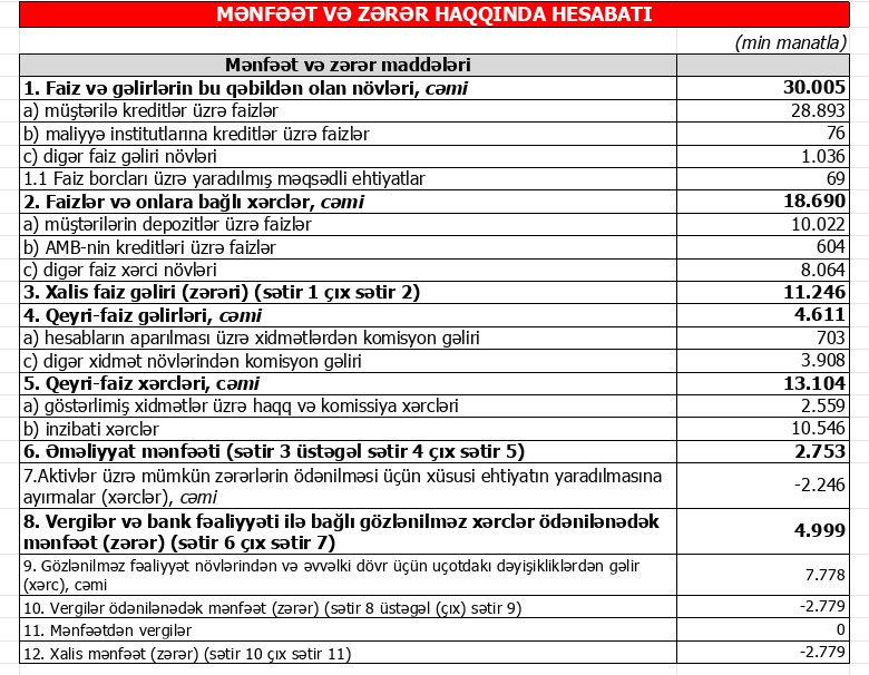 Qeyd edilib ki, 2022-ci iln yekunları ilə müqayisədə bankın faiz gəlirləri 12% artaraq 2023-cü ilin sonuna 30 milyon manatdan, xalis faiz gəlirləri isə 14% artaraq 11 milyon manatdan artıq olmuşdur. Bankın xalis əməliyyat mənfəəti 3.3 dəfə artaraq 2.8 milyon manatı üstələmişdir.