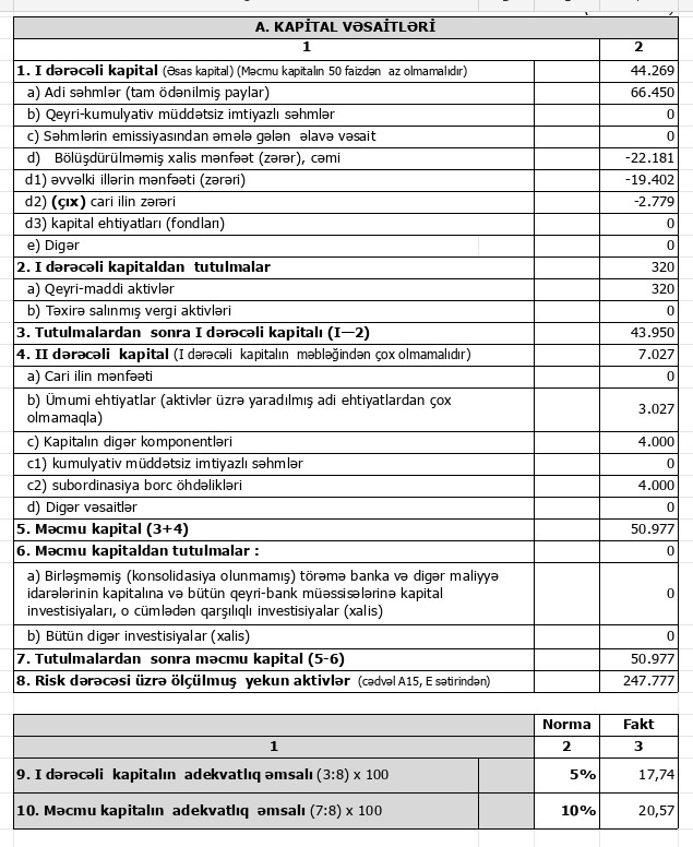 2023-cü ilin sonuna Bankın məcmu kapitalı 51 milyon manat təşkil etmişdir, bu da Mərkəzi Bankın minimum tələbindən (50 milyon manat) yüksəkdir. Məcmu kapitalın adekvatlıq göstəricisi 20.6% təşkil etməklə, Mərkəzi Bankın minimum tələbini (10%) əhəmiyyətli dərəcədə üstələyir.