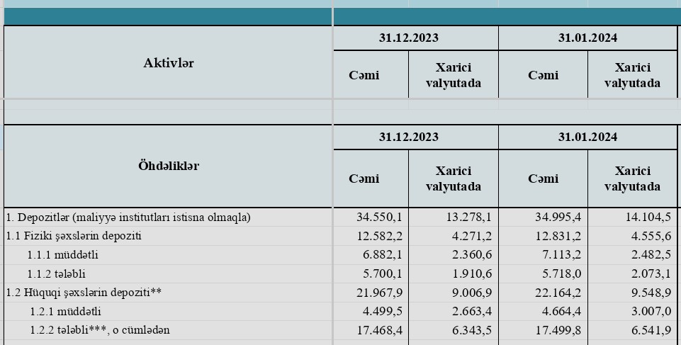 Yanvarda fiziki şəxslərin cəmi depozitləri 249 milyon manat artaraq 2024-cü ilin yanvar ayının sonunda 12 milyard 831,2 milyon manata çatıb. Yanvarda cəmi fiziki şəxslərin depozitlərinə daxil olan fiziki şəxslərin xarici valyutada depozitləri isə 284,4 milyon manat artıb. Bu o deməkdir ki, Yanavrda milli valyutada fiziki şəxslərin depozitləri 35,4 milyon manat azalıb.