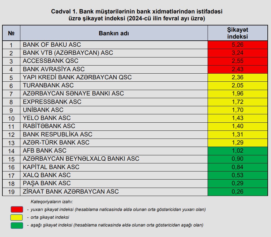 Orta şikayət indeksində isə "Yapı Kredi Bank Azərbaycan", "Turanbank", "Azərbaycan Sənaye Bankı", "Expressbank", "Unibank", "Yelo Bank", "Rabitəbnak", "Bank Respublika" və "Azər-Türk Bank" yer tutublar.