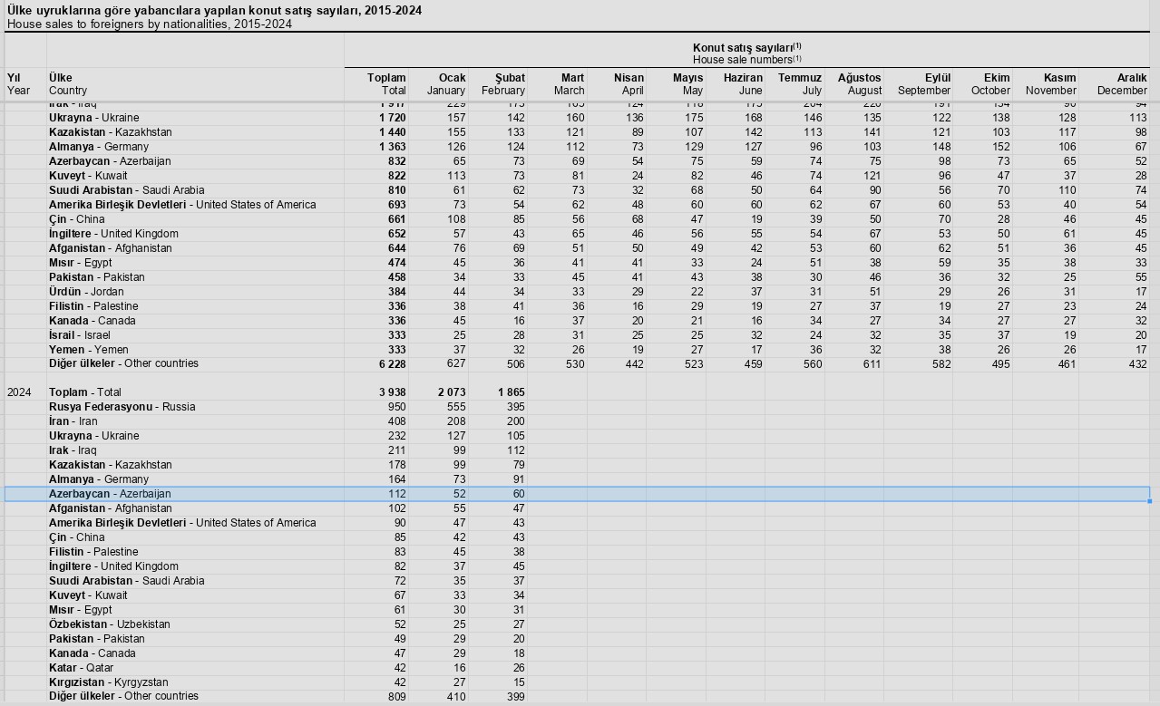 Azərbaycanlılar Türkiyədə 2021-ci ildə 1517 ev, 2022-ci ildə 1330 ev, 2023-cü ildə isə 832 ev alıblar.