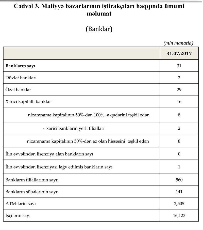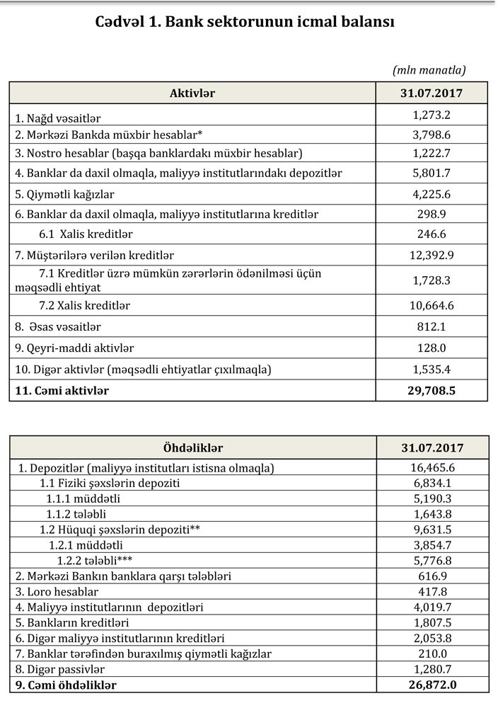 Maliyyə Bazarlarına Nəzarət Palatasından “Marja”ya daxil olmuş məlumata görə, Azərbaycanda fəaliyyət göstərən 31 bankın 31 iyul 2017-ci il tarixinə cəmi aktivləri 29 milyard 708.5 milyon manat, cəmi öhdəlikləri 26 milyard 872.0 milyon manat təşkil etmişdir. Sektorun balans kapitalı 2 milyard 836.5 milyon manatdır. Əhalinin əmanətləri 6 milyard 834.1milyon manat həcmindədir.