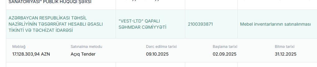 Bundan əvvəl, 2025-ci ildə "VEST-LTD" şirkəti Azərbaycan Respublikası Milli Arxiv İdarəsilə 780 min manatlıq, Elm və Təhsil Nazirliyinin Təsərrüfathesablı Əsaslı Tikinti və Təchizat İdarəsi 4 milyon 475 min manatlıq və 1 milyon 706 min manatlıq, Azərbaycan Dövlət İqtisad Universiteti ilə 1 milyon 229 min manatlıq müqavilə imzalayıb. “Vest-LTD” QSC cari mebel inventarlarından başqa digər malların satışı və təmir işləri fəaliyyətlərilə də məşğul olur.