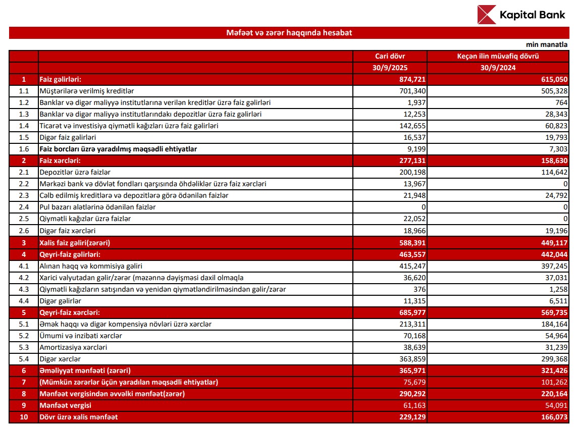 Kapital Bank böyüməkdə davam edir. Bankın həm gəlirləri, həm də aktivləri artıb. Bank 2025-ci ilin 9 ayında “mənfəət yarışında” da ön yerlərdən birini tutur.