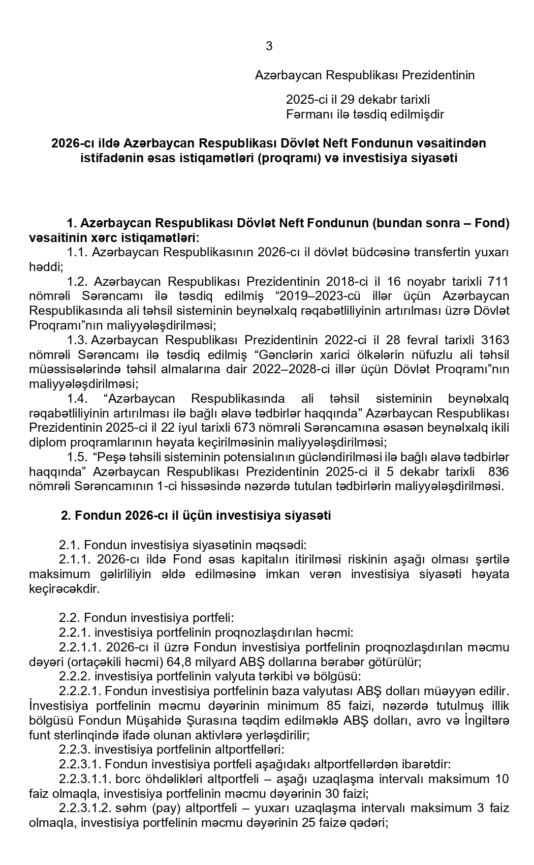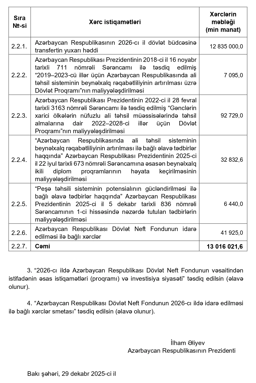 Azərbaycan Respublikası Prezidenti İlham Əliyev "Azərbaycan Respublikası Dövlət Neft Fondunun (ARDNF) 2026-cı il büdcəsi haqqında" Fərman imzalayıb.