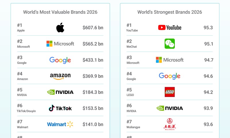 2026-cı ildə Global 500 siyahısında ilk 10 marka ümumi marka dəyərinin 27%-ni təşkil edir ki, bu da ABŞ-ın aparıcı texnologiya nəhənglərinin qlobal iqtisadiyyatda üstünlüyünün davam etdiyini göstərir. İlk onluqdakı markalardan altısı ABŞ texnologiya şirkətləridir. Apple-dan sonra Microsoft 2026-cı ildə 23% artımla 565,2 milyard dollardan çox marka dəyəri ilə dünyanın ikinci ən dəyərli markasıdır. Google (5% artımla 433,1 milyard dollar) və Amazon (4% artımla 369,9 milyard dollar) isə müvafiq olaraq üçüncü və dördüncü yerləri qoruyub.  NVIDIA 184,3 milyard ABŞ dolları marka dəyəri ilə dünyanın beşinci ən dəyərli markasıdır.