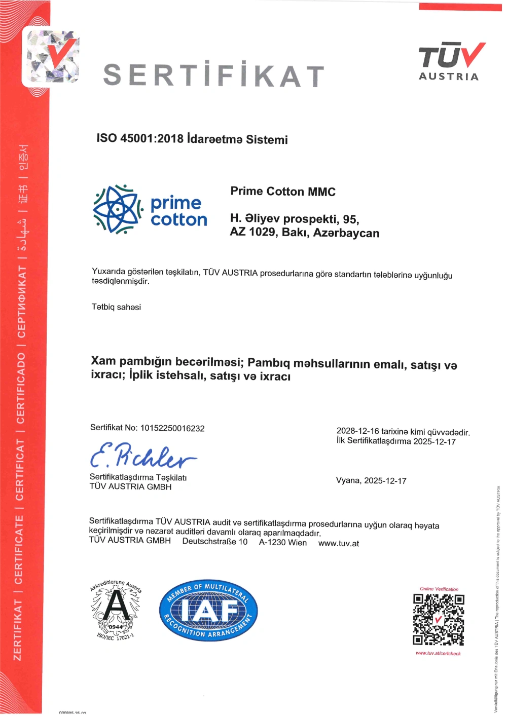 Sertifikatlaşdırma prosesi beynəlxalq səviyyədə yüksək nüfuza malik “TÜV Austria Azərbaycan” şirkəti tərəfindən həyata keçirilmişdir. Yeni əldə olunan sertifikatlar “Prime Cotton” MMC-də keyfiyyət, əməyin mühafizəsi, sağlamlıq və ətraf mühit üzrə proseslərin vahid idarəetmə sistemi çərçivəsində qurulduğunu və davamlı təkmilləşdirildiyini təsdiqləyir.