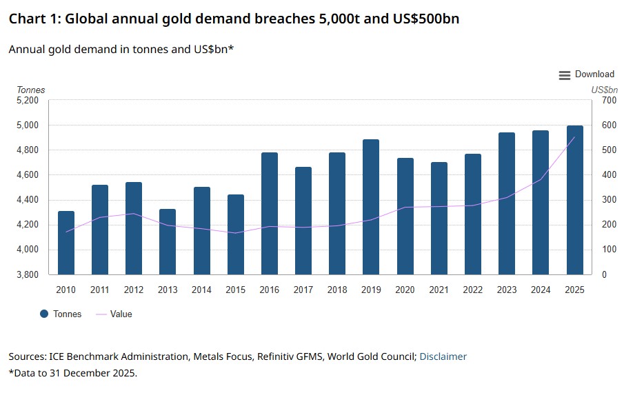 Tələb həcmləri və qızılın qiyməti rekordları darmadağın edib. Ötən il ümumi qızıl tələbi ilk dəfə 5000 ton həddini aşıb.Dünya Qızıl Şurası (World Gold Council - WGC) tərəfindən “Gold Demand Trends: Q4 and Full Year 2025” hesabatı dərc edilib.