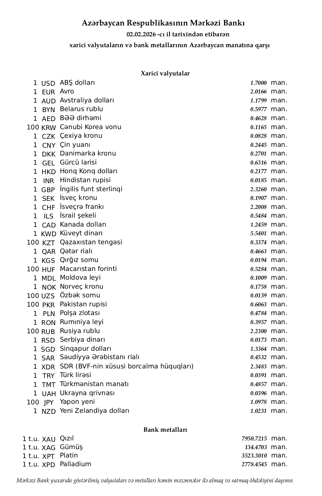 Rəsmi məzənnələr açıqlandı