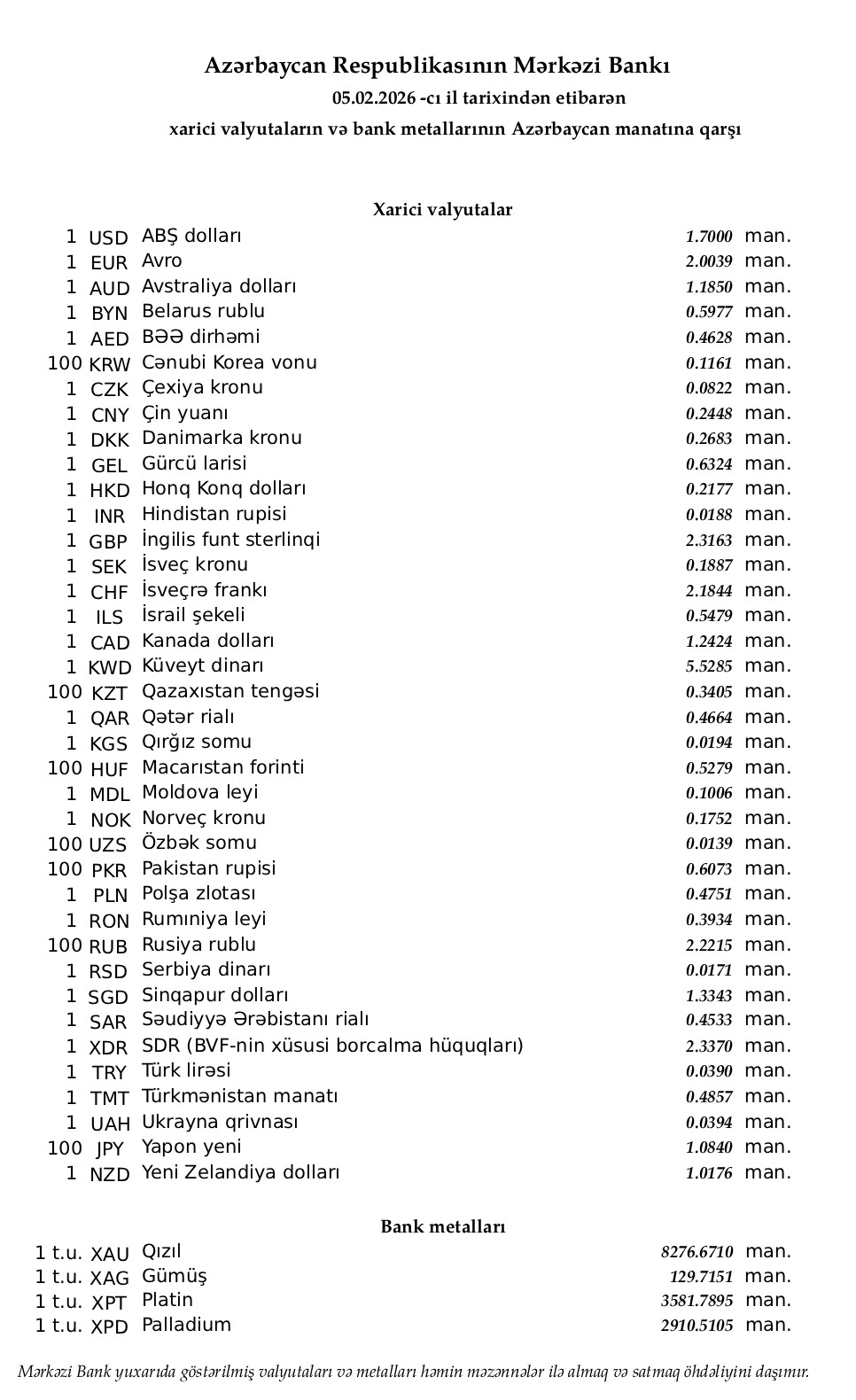 Rəsmi məzənnələr açıqlandı