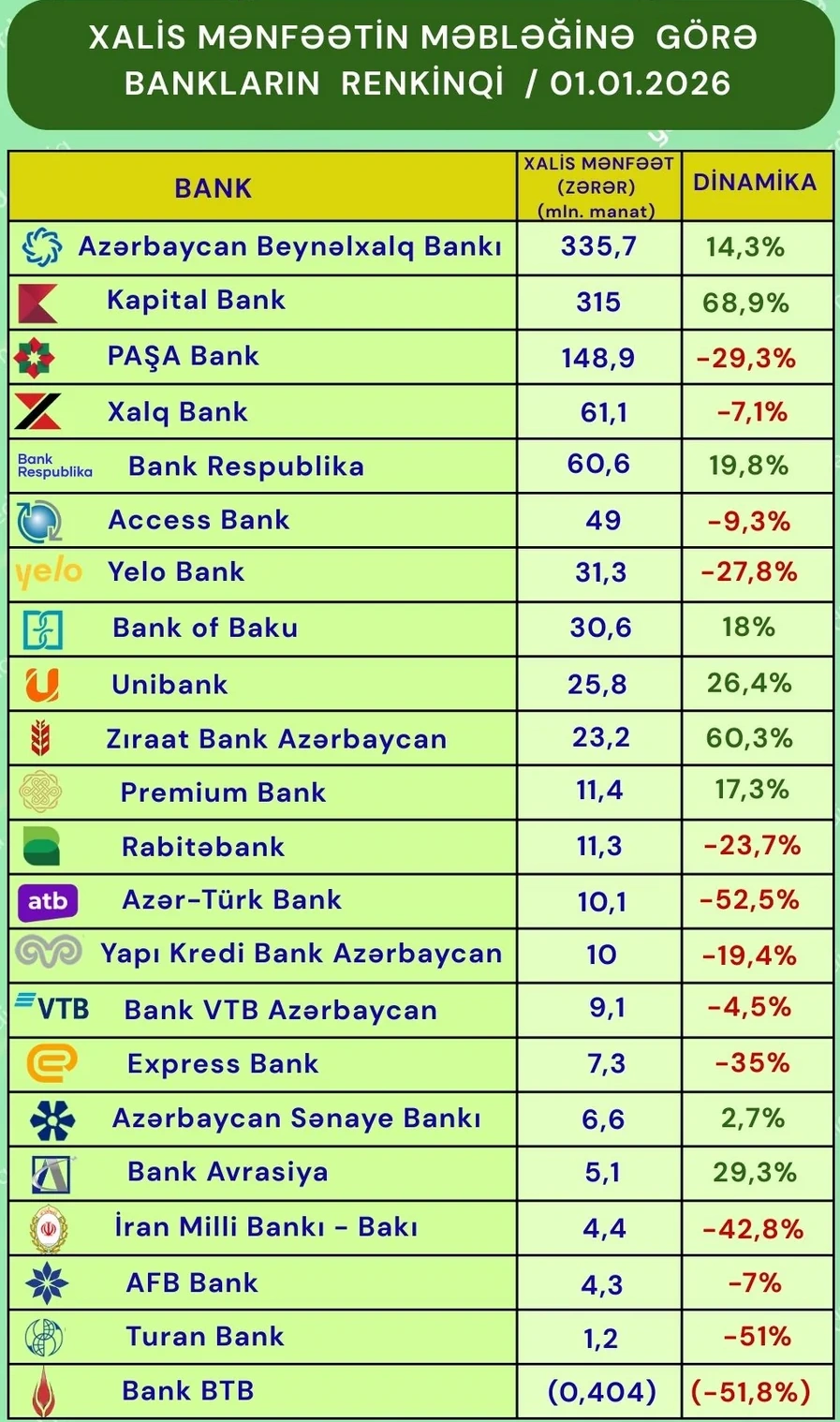 2025-ci ildə Azərbaycandakı 22 bankdan 5-nin (xalis) mənfəəti 50 milyon manatdan çox olub.