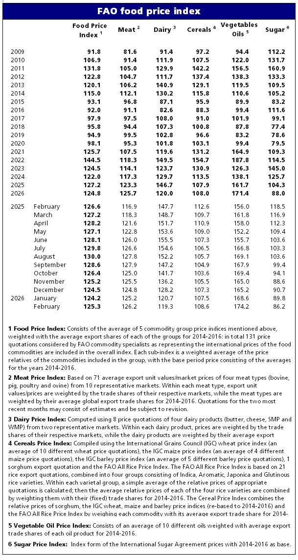 Marja xəbər verir ki, Ərzaq və Kənd Təsərrüfatı Təşkilatının (FAO) Ərzaq Qiymətləri İndeksi (FFPI) 2026-cı ilin fevral ayında orta hesabla 125,3 bənd təşkil edib ki, bu da yenilənmiş yanvar göstəricisi ilə müqayisədə 1,1 bənd (0,9 faiz) çoxdur.