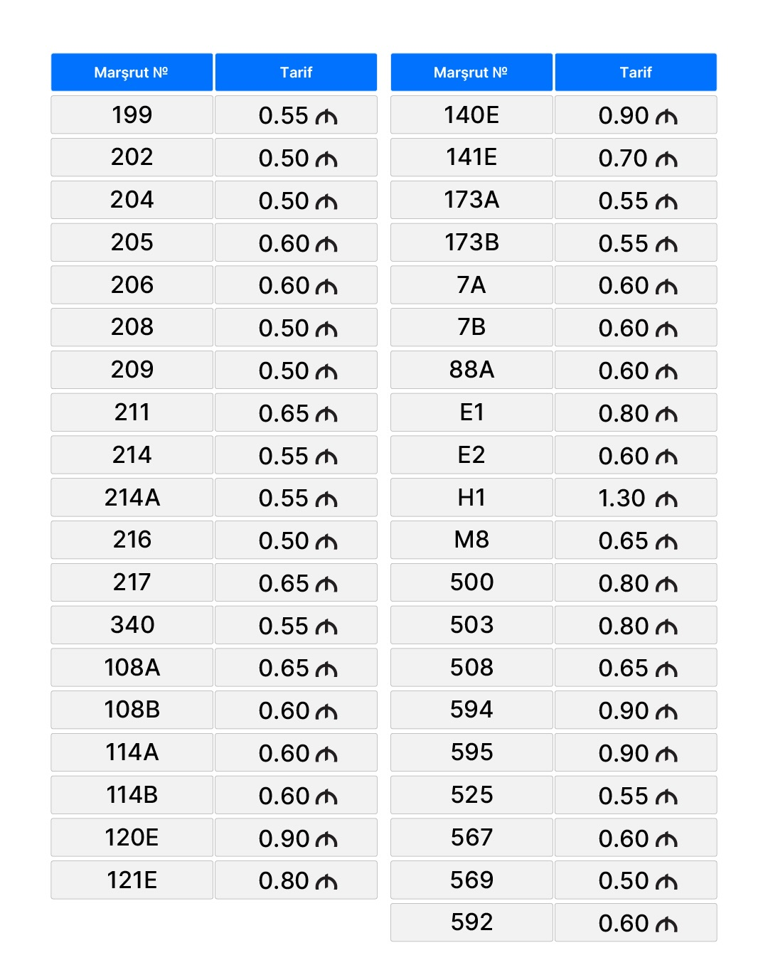 Bakı və paytaxtətrafı avtobuslarda yeni qiymətlər müəyyənləşibBakı və paytaxtətrafı marşrut avtobuslarında yenilənmiş nağdsız gedişhaqqı tarifləri müəyyənləşib.