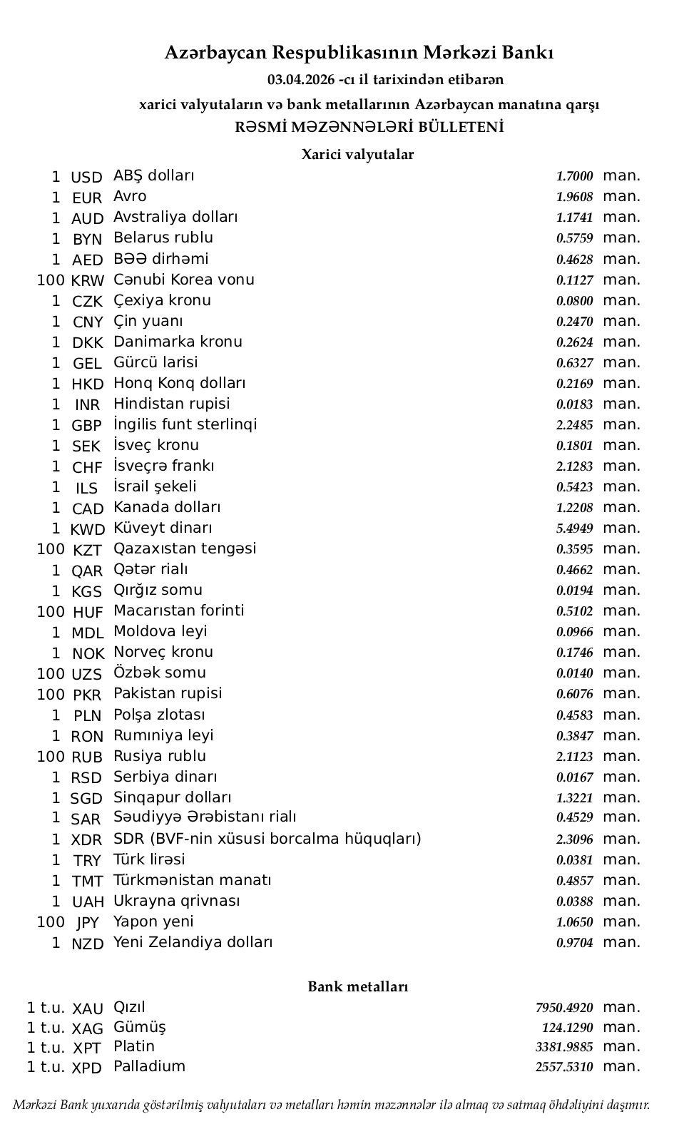 Rəsmi məzənnələr açıqlandı