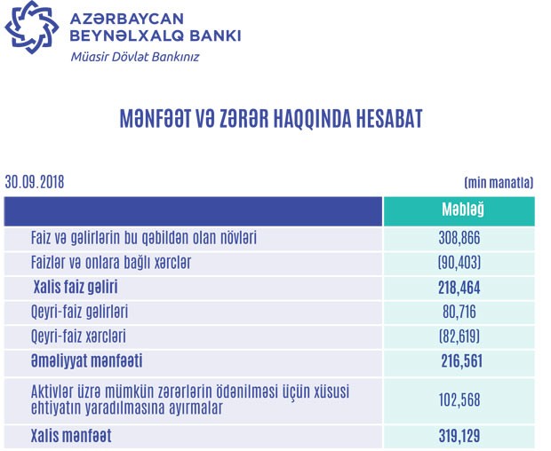 Fəaliyyətin səmərəliliyinin və effektivliyinin artırılması Azərbaycan Beynəlxalq Bankının mənfəətinə də müsbət təsir göstərib. Bank ilin 9 ayını 319 milyon manat mənfəətlə başa vurub. Bu dövrdə bankın faiz gəlirləri – 308 milyon manat təşkil edib. Bankın əməliyyat gəlirləri 87 milyon manat olmaqla qeyri-faiz xərclərini tam qarşılayıb.