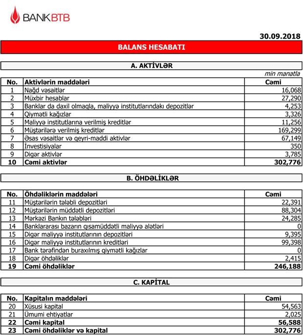 “Bank BTB” ASC 30 Sentyabr 2018-ci il tarixində 302 milyon 776 min manat cəmi aktivlərə, 246 milyon 188 min manat cəmi öhdəliklərə və 56 milyon 588 min manat cəmi balans kapitalına malik olub.