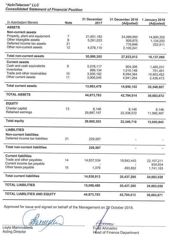 31 Dekabr 2017-ci il tarixində "AzİnTelekom" təxminən 45 milyon manat cəmi aktivlərə malik olub. Aktivlərin 5,6 milyon manatı nağd pul olub. Şirkətin 2018-ci ildə 221,7 milyon avro ödəyərək "Azercell"in yarıdan çoxunu alması maraq doğurur.