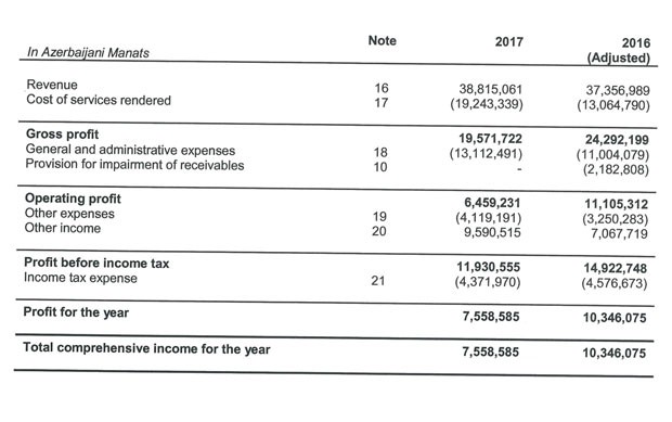 2016-cı illə müqayisədə isə xidmətlərin maya dəyəri 47,3% artaraq 19 milyon 243 min manat təşkil edib. Nəticədə, gəlirin artmasına baxmayaraq xidmətlərin maya dəyəri yüksəldiyindən xalis gəlir 2016-cı ildəki 24 milyon 292 min manatdan 2017-ci ildə 19 milyon 572 min manat düşüb.