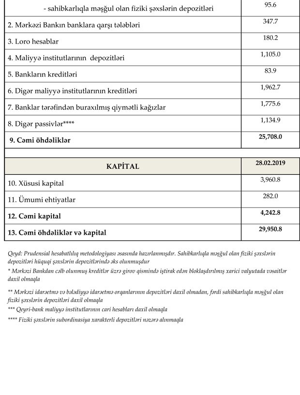 Sektorun balans kapitalı 4 milyard 242.8 milyon manat olub. 2019-cu ilin fevral ayı ərzində bank sektorunun aktivləri 1.2% (348 milyon manat), öhdəlikləri 0.9% (222.3 milyon. manat), balans kapitalı isə 3.0% (125.5 milyon manat) artıb.