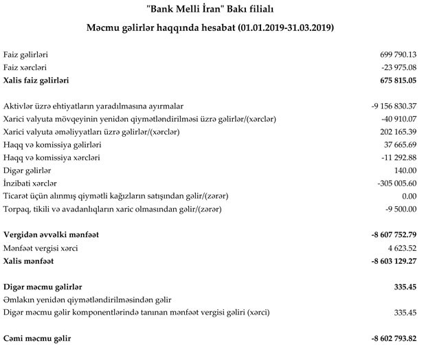 "Bank Melli İran" Bakı filialı 2019-cu ilin birinci rübünü 8 milyon 603 min manat xalis zərər ilə başa vurub. Müqayisə üçün qeyd edək ki, Bank ötən ilin eyni dövrünü 856 min manat xalis mənfəətlə bağlamışdı. "Bank Melli İran" Bakı filialı ehtimal olunan depozit və kredit itkiləri üzrə yenidən böyük məbləğdə ehtiyat yaratdığı üçün zərər edib.