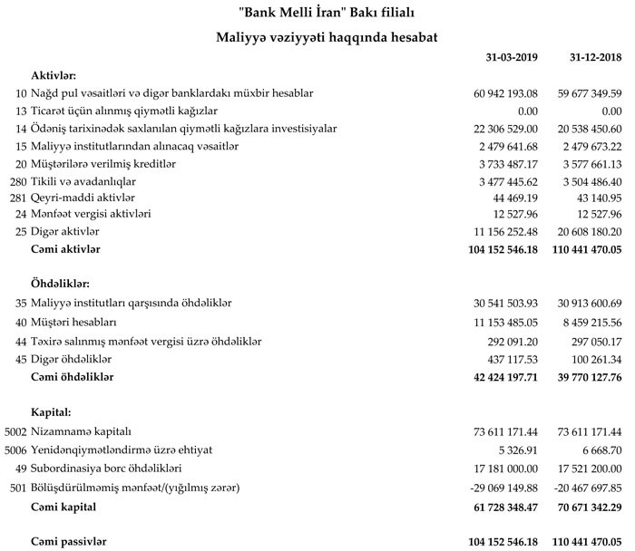 Müqayisə olunan dövrdə, bankın cəmi aktivləri 6 milyon 289 min manat azalaraq 104 milyon 152 min manata düşüb. Ötən ilin sonunda "Bank Melli İran" Bakı filialı 110 milyon 441 min manat cəmi aktivlərə malik idi.