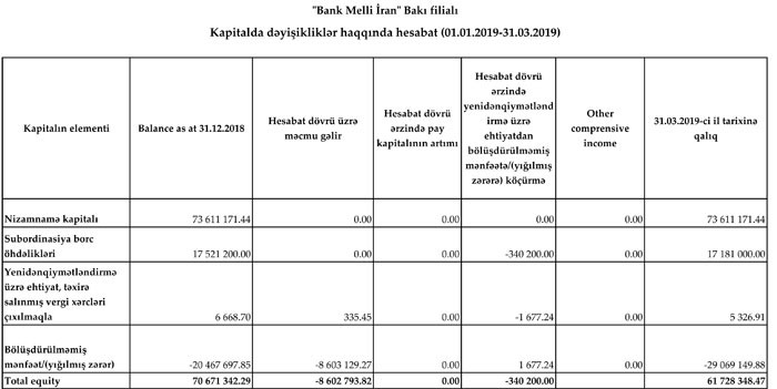 İlk rübdəki 8 milyon 603 min manat zərər kapitalın azalmasına səbəb olub. 2018-ci ilin sonunda 70 milyon 671 min manat təşkil etmiş cəmi kapital 31 Mart 2019-cu il tarixində 61 milyon 728 min manata düşüb.